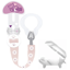 Este chupetero se adapta a todo tipo de chupetes, ya sean de botón o anilla, así como mordedores y juguetes, gracias a su anillo y lazo flexible.