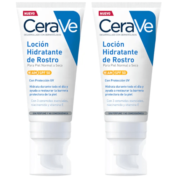 - 2 x Cerave Loción Hidratante Facial SPF50 Hidrata y Protege tu Piel del Sol 52 ml