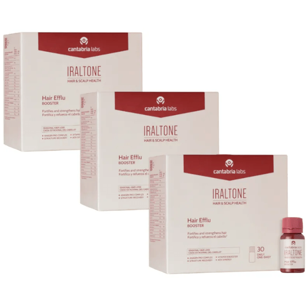 https://www.atida.com/es-es/iraltone-hair-efflu-booster-3x30-monodosis-bebibles525949808423Iraltone Hair Efflu Booster 3x30 Monodosis Bebibles<p><span style="font-weight: bold;">Iraltone Hair Efflu Booster 3x30 Monodosis Bebibles</span></p><p><span style="font-weight: bold;">¡Para combatir la caída del cabello de manera eficaz!</span></p><p>Este tratamiento avanzado no solo aborda los síntomas, sino que va a la raíz del problema, <span style="font-weight: bold;">fortaleciendo los folículos capilares y restaurando el ciclo de crecimiento del cabello </span>para una <span style="font-weight: bold;">melena</span> visiblemente más<span style="font-weight: bold;"> densa, fuerte y saludable</span>.</p><p>Específicamente formulado para aquellos que<span style="font-weight: bold;"> enfrentan caída aguda y estacional del cabello,</span> esta fórmula única se enfoca en revitalizar tu cabello desde el interior.</p><p>Compuesto por:</p><p><span style="font-weight: bold;">- Anagen Pro Complex,</span> con <span style="font-weight: bold;">extractos de guisante y comino</span>, optimiza la fase de crecimiento de tu cabello</p><p><span style="font-weight: bold;">- Complejo Structure Recovery</span> aporta los componentes esenciales para <span style="font-weight: bold;">reparar y fortalecer la estructura capilar.</span></p><p><span style="font-weight: bold;">- La vitamina B y los precursores de colágeno</span> se unen en esta sinergia perfecta, asegurando que cada hebra de cabello se nutra intensamente y se fortalezca desde la raíz. </p><p>- Exclusiva mezcla<span style="font-weight: bold;"> Sinergy AOX, que incluye vitamina C, E y cúrcuma,</span> proporciona una potente <span style="font-weight: bold;">protección antioxidante y antiinflamatoria, </span>esencial para mantener tu cabello y cuero cabelludo en óptimas condiciones frente a la adversidad ambiental y el estrés.</p><p>Con su irresistible <span style="font-weight: bold;">sabor a piña colada</span>, este complemento bebible es la forma más placentera de cuidar tu cabello y uñas.</p><p>Apto para <span style="font-weight: bold;">veganos y libre de gluten y lactosa.</span></p>https://assets.atida.com/transform/5c7cc622-d7c1-467d-bd69-77a5592e9004/Iraltone-Hair-Efflu-Booster-3x30-Monodosis-Bebibles?io=transform:extend,width:250,height:250134.99instock149.85122.718180818181014.86Cantabria Labshttps://www.atida.com/media/catalog/product/b/e/a/1/bea14b82f9f776e971b6554dde3a2af1762e91b2_Iraltone_Hair_Efflu_Booster_3x30_Monodosis_Bebibles.png/Salud e Higiene/Cuidado del Cabello/Anticaída/Salud e Higiene/Cuidado del Cabello/Tratamiento/Packs Ahorro/Packs Vitaminas y Suplementos/Packs Ahorro/Salud e Higiene/Salud e Higiene/Cuidado del Cabello/Vitaminas y Suplementos/Vitaminas y Suplementos/Suplementos/Dias Sin IVA 10%/Singles' Day ¡-11% Extra! - 2025 2025-09-19T23:45:00+0000