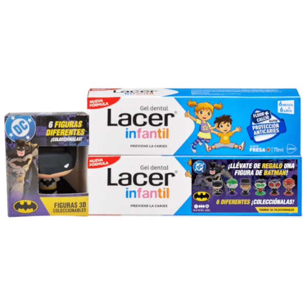 Lacer Gel Infantil 6m-6 Años 2x75 ml + Figura de Batman es un dentífrico especialmente diseñado para los niños, que protege eficazmente contra la caries y refuerza el esmalte dental.