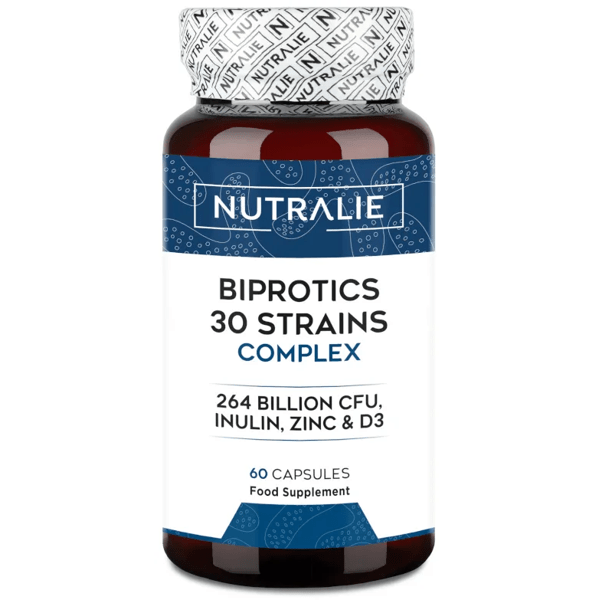 https://www.atida.com/es-es/nutralie-biprotics-30-cepas-132-billones-ufc-60-capsulas112382639389Nutralie Probioticos 30 Cepas 264 billones UFC Biprotics 60 Cápsulas<p><span style="font-weight: bold;">Nutralie Biprotics</span> es un complemento alimenticio a base de <span style="font-weight: bold;">probióticos</span>, con <span style="font-weight: bold;">264 mil millones de UFC</span> (Unidades Formadoras de Colonias) por dosis y 30 cepas de los grupos de los lactobacilos, bifidobacterias, pediococcus, streptococos, lactococcus y leuconostoc.</p><p>Contiene <span style="font-weight: bold;">vitamina D, zinc e inulina </span>que contribuyen al funcionamiento normal del sistema inmunitario. El <span style="font-weight: bold;">zinc </span>también favorece el metabolismo normal de los hidratos de carbono, macronutrientes y los ácidos grasos, y contribuye también a la síntesis proteínica normal, según avala la Autoridad Europea de Seguridad Alimentaria (EFSA).</p><p>Indicado para mantener en buen estado el sistema digestivo, y especialmente la <span style="font-weight: bold;">flora intestinal</span>.</p><p>