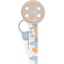 Su pinza, fácil de sujetar a la ropa, lleva unida una argolla en la cual se introduce el chupete. Con una placa en forma de botón, este chupetero se convierte en el mejor aliado del chupete y de los padres.