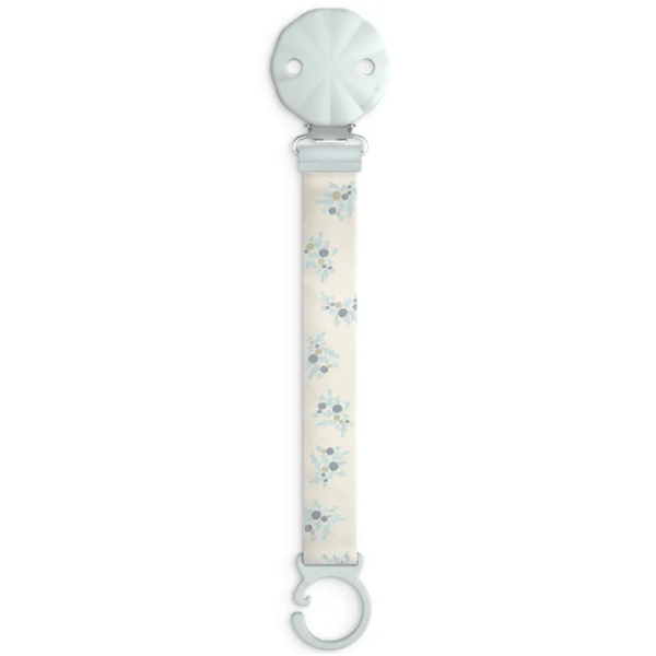 La pinza robusta permite una sujeción segura a la ropa del bebé, minimizando el riesgo de que el chupete se caiga, ensucie o se pierda durante el día. La cinta textil del broche es reversible, presentando un encantador diseño floreado en ambas caras, lo que permite variar el estilo según el gusto del usuario.