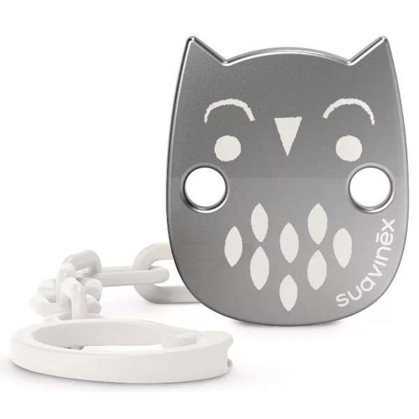Su función es sujetar el chupete a la cuerda del bebé, evitando que se caiga al suelo, se ensucie o se pierda. Está fabricado con un efecto metalizado mate y cuenta con una placa con forma de búho , siguiendo el diseño de la colección Bonhomía.