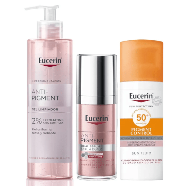 - Eucerin Anti-Pigment Gel Limpiador 400 ml: Aqua, Alcohol Denat, Sodium Cocoamphoacetate, Glycerin, Coco-Betaine, Lactic Acid, Sodium Chloride, Dehydroxanthan Gum, Glycolic Acid, Glyceryl Glucoside, Sodium Hydroxide, Sodium Benzoate. - Eucerin Anti-Pigment Dual Sérum Facial Antimanchas 30 ml: Agua, alcohol desnaturalizado, butilenglicol, glicerina, octocrileno, palmitato de isopropilo, isononanoato de cetearilo, fosfato de dialmidón, metilpropanediol, isobutilamido tiazolil resorcinol, fosfato de ascorbilo sódico, hialuronato de sodio, extracto de raíz de Glycyrrhiza Inflata, tocoferol, glucosilrutina, estearoil glutamato de sodio, estearato de glicerilo, poliacrilato de sodio, dimeticona, isoquercitrina, ácido cítrico, cloruro de sodio, EDTA trisódico, caprilil glicol, fenoxietanol, perfume. - Eucerin Fluido Solar Facial Pigment Control SPF 50+ 50 ml: Agua, C12-15 alquil benzoato, alcohol desnaturalizado, butil metoxidibenzoilmetano, etilhexil triazona, bis-etilhexiloxifenol metoxifenil triazina, dibutil adipato, citrato de estearato de glicerilo, sílice, ácido fenilbenzimidazol sulfónico, dietilamino hidroxibenzoil hexil benzoato, almidón de tapioca, dimetil sililato de sílice, alcohol cetearílico, alcohol behenílico, isobutilamido tiazolil resorcinol, extracto de raíz de Glycyrrhiza Inflata, ácido glicirretínico, acetato de tocoferilo, glicerina, copernicia cerifera cera, goma xantana, salicilato de etilhexilo, dicaprilato/dicaprato de butilenglicol, homosalato, octocrileno, C12-15 alquil benzoato, tocoferol, glucosilrutina, isoquercitrina, extracto de Chondrus Crispus, goma xantana, carragenano, hidroxipropilmetilcelulosa, hidróxido de sodio, EDTA trisódico, hidroxiacetofenona, fenoxietanol, etilhexilglicerina, perfume.Como usar
