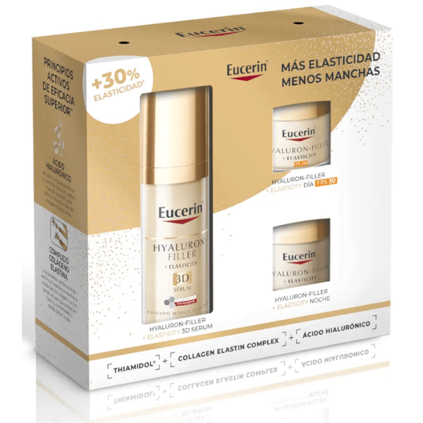 https://www.atida.com/pt-pt/eucerin-elasticidade-serum-3d-30-ml-creme-dia-20-ml-creme-noite-20-ml427743385284Eucerin Elasticity 3D Serum 30 ml + Creme de Dia 20 ml + Creme de Noite 20 ml<p><span style="font-weight: bold;">Eucerin Elasticity 3D Serum 30 ml + Creme de Dia 20 ml + Creme de Noite 20 ml</span></p><p> Prepare-se para combater manchas e rugas da idade.</p><p> Este sérum despigmentante leve e hidratante da Eucerin, adequado para todos os tipos de pele, proporciona benefícios fundamentais para cuidar da pele madura graças à sua fórmula com ácido hialurônico, arctiína e tiamidol:</p><p> 1. Melhora a elasticidade da pele e acelera a renovação do colágeno nas células da pele.</p><p> 2. Reduz as manchas da idade e previne o seu reaparecimento.</p><p> 3. Preenche visivelmente as rugas profundas.</p><p> 4. Firma visivelmente a pele.</p><p> 5. Oferece à pele um aspecto fresco e rejuvenescido.</p><p> Estudos clínicos e dermatológicos demonstraram boa tolerabilidade deste soro antienvelhecimento. Entre 97 e 100% das 120 mulheres que participaram de um estudo com o produto afirmaram que, após quatro semanas, esse creme facial melhora a elasticidade da pele, firma-a visivelmente, preenche rugas profundas e reduz o aparecimento de manchas senis, entre outros benefícios.</p><p> O pack inclui dois mini tamanhos: creme de dia e creme de noite da mesma gama.</p>https://assets.atida.com/transform/08e4d2bf-17dc-4cb9-942d-003215e65806/Eucerin-Elasticity-Serum-3D-30-ml-Crema-Dia-20-ml-Crema-Noche-20-ml?io=transform:extend,width:250,height:25038.99instock48.9531.69918599187209.96Eucerinhttps://www.atida.com/media/catalog/product/b/d/b/a/bdbac1943807ef663b61168d95d4c6538e0c664e_Eucerin_Elasticity_Serum_3D_30_ml_Crema_Dia_20_ml_Crema_Noche_20_ml.png/Beleza/Beleza/Rosto/Beleza/Rosto/Anti-Envelhecimento/Beleza/Rosto/Serum/Presentes/Coffrets para ela/Presentes/Presentes/Para ela/minipreços/Aproveite o desconto EXTRA!/Acumular até 5% em Atida Cash/DIAS SIN IVA 23%/Singles' Day -11% Extra!2024-09-02T23:42:30+0000