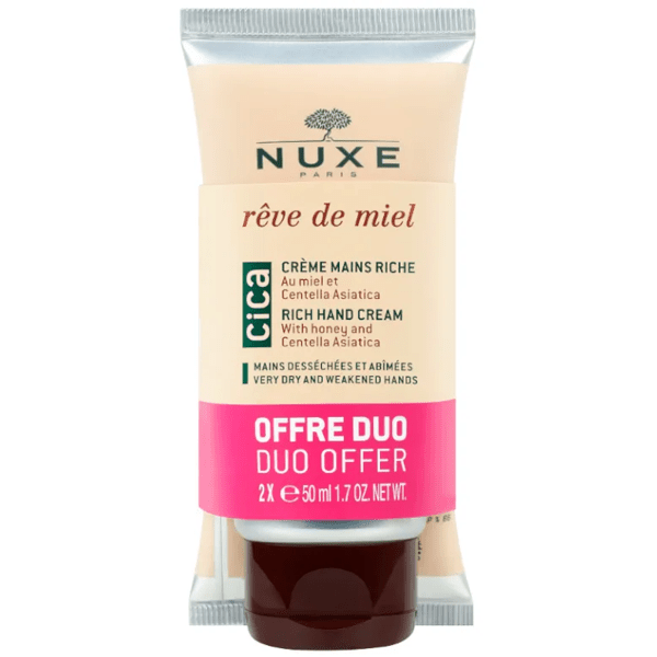 https://www.atida.com/pt-pt/nuxe-reve-de-miel-creme-de-m-os-cica-2x50-ml333374095078Nuxe Rêve de Miel Creme de Mãos Cica 2x50 ml<p><span style="font-weight: 700;">Nuxe Rêve de Miel Creme de Mãos Cica 2x50 ml</span><br></p><p>Creme para as mãos formulado com mel de lavanda da Provença e centella asiática, ideal para o cuidado das mãos secas, danificadas e gretadas.</p><p>A sua fórmula rica nutre, acalma e repara ao mesmo tempo que reforça a barreira cutânea.</p><p>Textura fundente, que não deixa sensação gordurosa ou pegajosa.</p><p>Perfume sem alérgenos que deixa nas mãos um aroma doce e sutil de mel.</p><p>Contém 98% de ingredientes de origem natural.</p><p>A Nuxe é uma empresa comprometida com a proteção das abelhas.</p><p>Ganhe duas unidades pelo melhor preço, edição limitada!</p><p><span style="font-weight: bold;">RESULTADOS</span></p><p>- 100%* das mulheres notam que as suas mãos estão nutridas e aliviadas da sensação de desconforto.</p><p>- 90%* das mulheres notam que as suas mãos parecem reparadas e sentem um “efeito penso rápido”.</p><p>- 100%* das mulheres notam o acabamento não pegajoso.</p><p>*Teste de uso – 21 voluntários. % de satisfação imediatamente após a aplicação.</p>https://assets.atida.com/transform/4cb159cd-a544-449f-a5a3-62e85bd369e1/Nuxe-Reve-de-Miel-Crema-de-Manos-Cica-2x50-ml?io=transform:extend,width:250,height:25010.99instock16.248.9349583495935325.25Nuxehttps://www.atida.com/media/catalog/product/8/a/d/e/8ade9057212665a5e49b3fbef368d69d2f4d9f9a_Nuxe_Reve_de_Miel_Crema_de_Manos_Cica_2x50_ml.png/Beleza/Beleza/Mãos e Unhas/Beleza/Mãos e Unhas/Hidratação de Mãos E Unhas/Cuidado Pessoal/Mãos e Unhas/Hidratação/Cuidado Pessoal/Cuidado Pessoal/Mãos e Unhas/Acumula até 20% em Atida Cash/Acumula 5% em Atida Cash/Acumula até 20% em Atida Cash/DIAS SIN IVA 23%/Singles' Day -11% Extra!/Black Friday Até -70%2023-08-28T23:41:51+0000